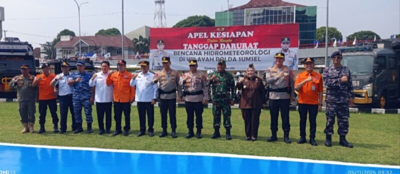 Palembang. Wakapolda Sumsel Brigjen Pol M.Zulkarnain,SIK,MSi pimpin Apel Kesiapan dalam rangka Tanggap Darurat Bencana Hidrometeorologi yang diselenggarakan di Halaman Mapolda Sumsel, Rabu (5/11/2025).