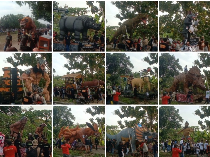 Peserta arak-arakan menampilkan berbagai macam ogoh-ogoh, seperti : ular naga, komodo, dinosaurus, kuda, tikus, banteng, dll. Setiap ogoh-ogoh memiliki makna dan arti tertentu. Musik dangdut dari beberapa blok juga, menjadi pengiring arak-arakan untuk menghibur pengunjung.