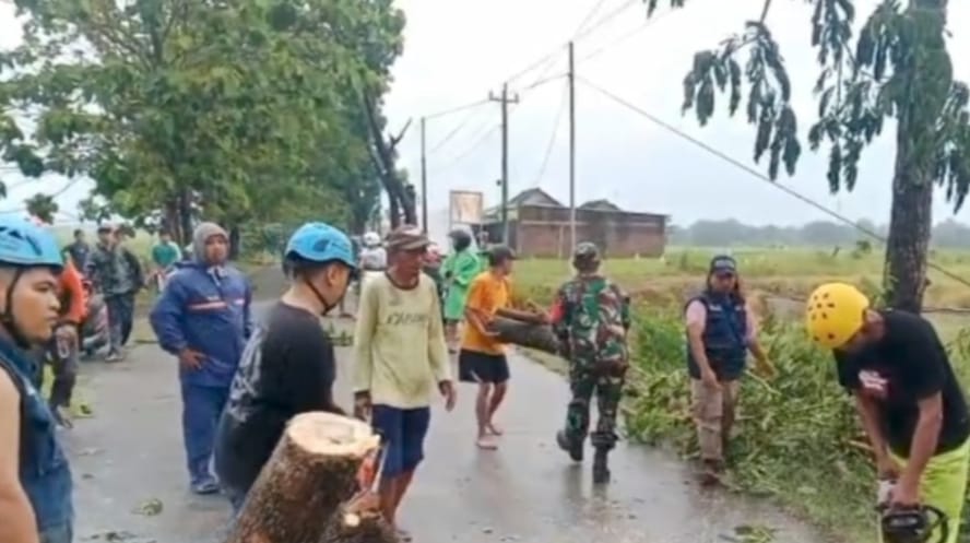 Sragen, Curah hujan yang disertai angin kencang pada Hari Jum’at (03/10/2025) menyebabkan sebuah pohon berukuran besar tumbang dan menutup sebagian badan jalan di Dukuh Saradan Desa Saradan Kecamatan Karangmalang. Melihat kondisi tersebut, Serda Batjo segera turun tangan membantu warga melakukan pembersihan agar akses jalan kembali normal.