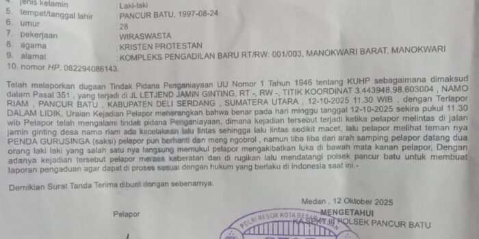 Tidak Terima atas kejadian itu Ersada Gurusinga (28) melaporkan kejadian ini ke Polsek Pancur Batu dengan Laporan Polisi Nomor : STTLP/B/412/X/2025/SPKT/POLSEK PANCUR BATU/POLRESTABES MEDAN/POLDA SUMATERA UTARA.
