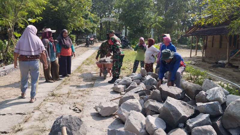 Sragen, Sebagai wujud nyata kemanunggalan TNI dengan rakyat, Sertu Heri P Babinsa Desa Gesi beserta Anggota Koramil 12/Gesi Kodim 0725/Sragen turun langsung membantu warga dalam kegiatan pembangunan talud jalan desa di Dukuh Gesi Kulon RT. 17 Desa Gesi, Senin (10/11/2025).