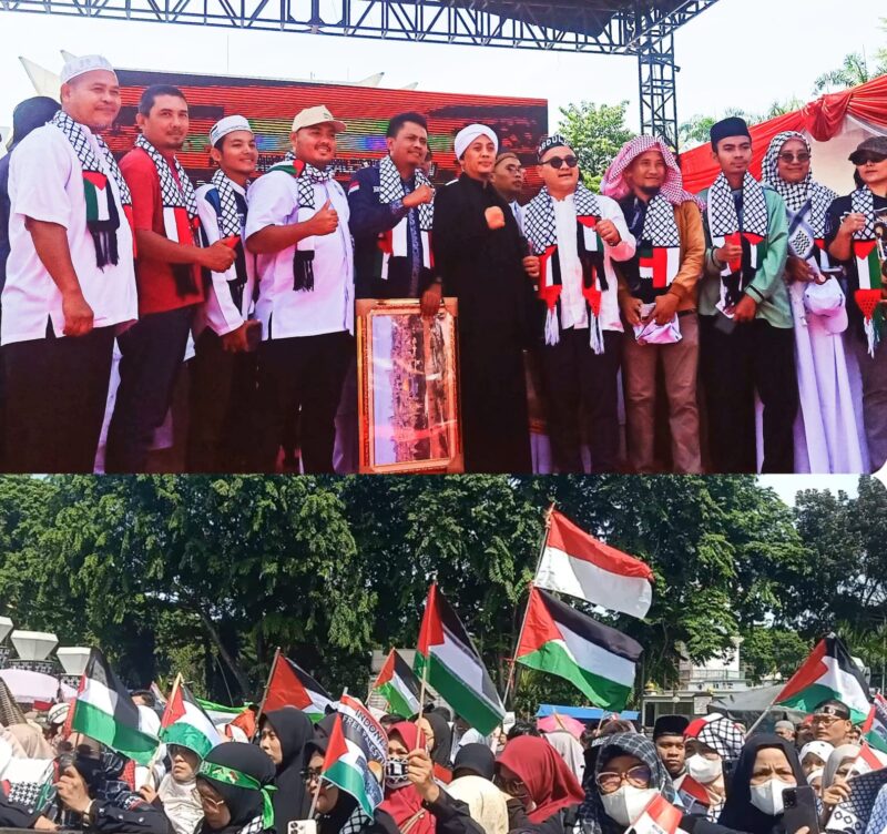 ratusan masyarakat Sumatera Selatan bersama Pemerintah Kota Palembang, para ulama, habib, dan tokoh masyarakat menggelar aksi damai bertajuk Palembang Peduli Palestina di halaman monumen bersejarah Kota Palembang, Minggu (9/11/2025).