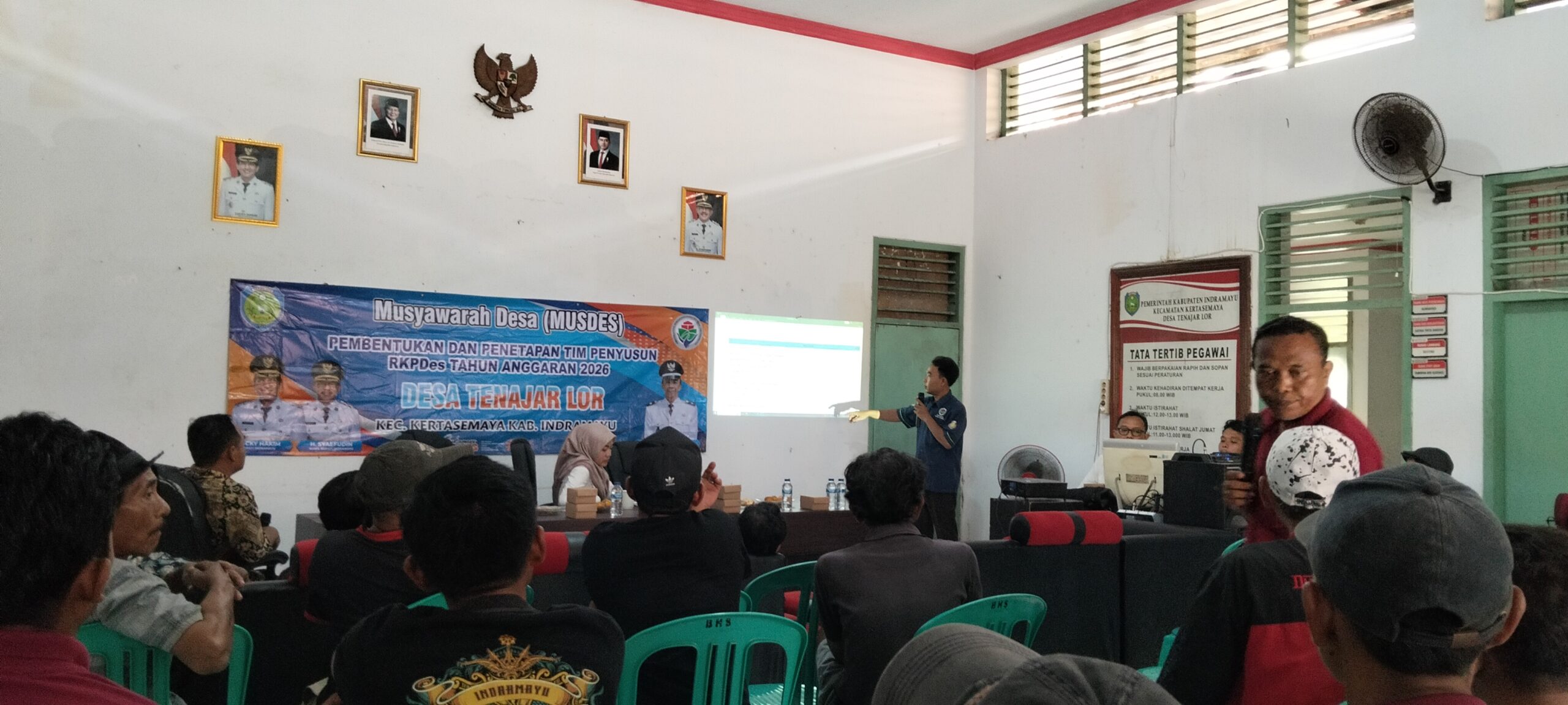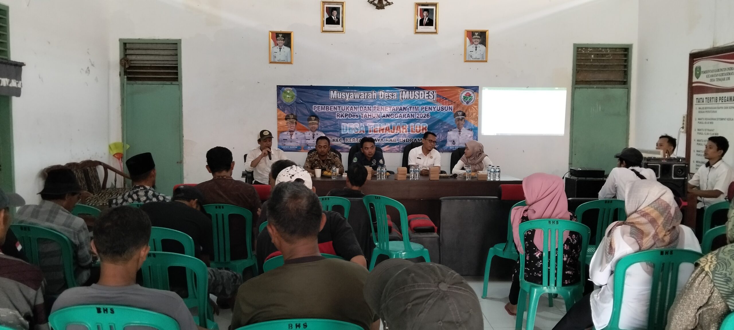 Desa Tenajar Lor, Kecamatan Kertasemaya, Kabupaten Indramayu, menggelar Musyawarah Desa (Musdes) untuk menyusun Rencana Kerja Pemerintah Desa (RKPDes) Tahun Anggaran 2026. Kegiatan ini dihadiri oleh berbagai pihak, termasuk PLH Lukman Hakim, Camat Kertasemaya yang diwakili oleh Kasi Tapem dan PMD, Pendamping Desa, Babinsa, Bhabinkamtibmas, BPD, kader PKK, kelompok tani, RT, RW, tokoh masyarakat, dan perwakilan warga dari berbagai blok. (08/10/2025)
