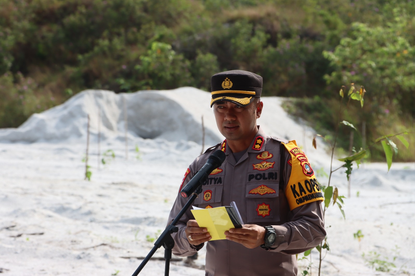 Polres Bangka Tengah (Bateng) berhasil menanam +-50 bibit pohon melingai di area pasca tambang di kelurahan padang mulia koba.