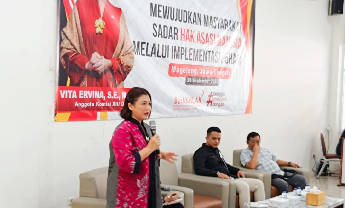 Anggota Komisi XIII DPR RI Fraksi PDI Perjuangan Dapil Jawa Tengah VI, Vita Ervina, S.E., M.B.A. bersama perwakilan Kanwil HAM Jawa Tengah, menggelar Sosialisasi tentang Implementasi Penghormatan, Perlindungan, Pemenuhan, Penegakan, dan Pemajuan Hak Asasi Manusia, Sabtu (20/09/2025) di Kota Magelang. (foto: Narwan)